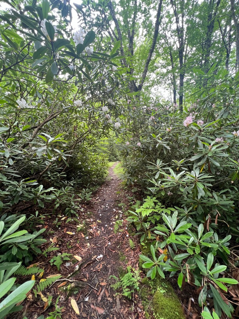 Soon after the trail begins, a dense rhododendron section creates a tunnel. Although I do enjoy the beauty of the green tunnel, it does open up after a short distance. The trail continues to descend into the valley at a gradual grade before intersecting with Rohrbaugh Trail in a rather rocky section. After a short jot past the intersection, the trail begins to descend with a series of steep switchbacks to reach Red Creek.
