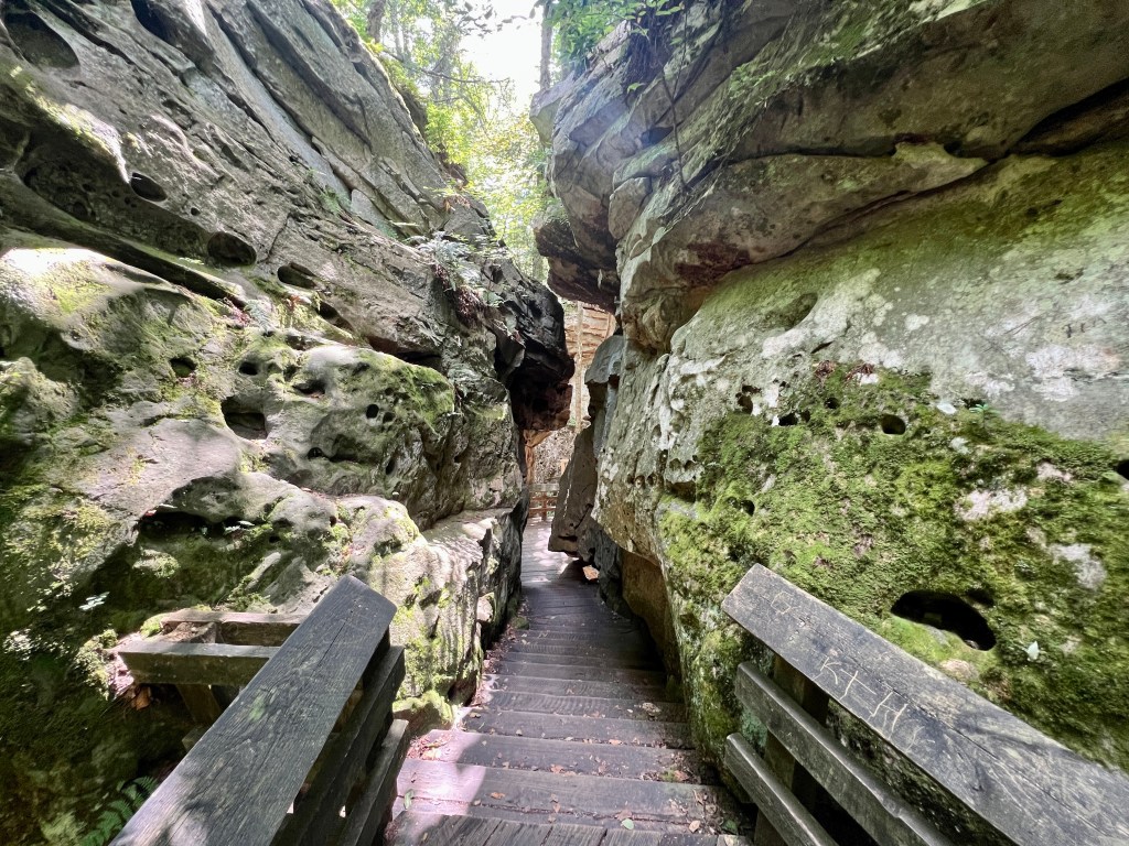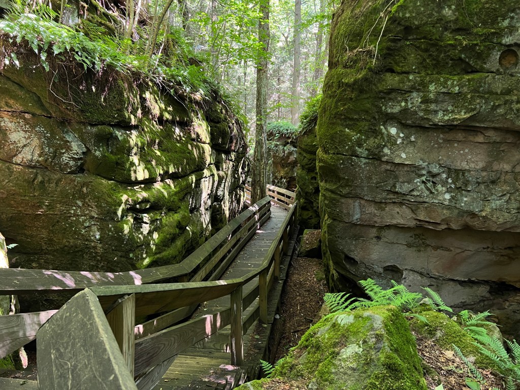 The Beartown boardwalk is scattered with several interpretive signs that share the ecological and geological features of the park. The Droop sandstone and lush moss and ferns make for a breathtaking experience.